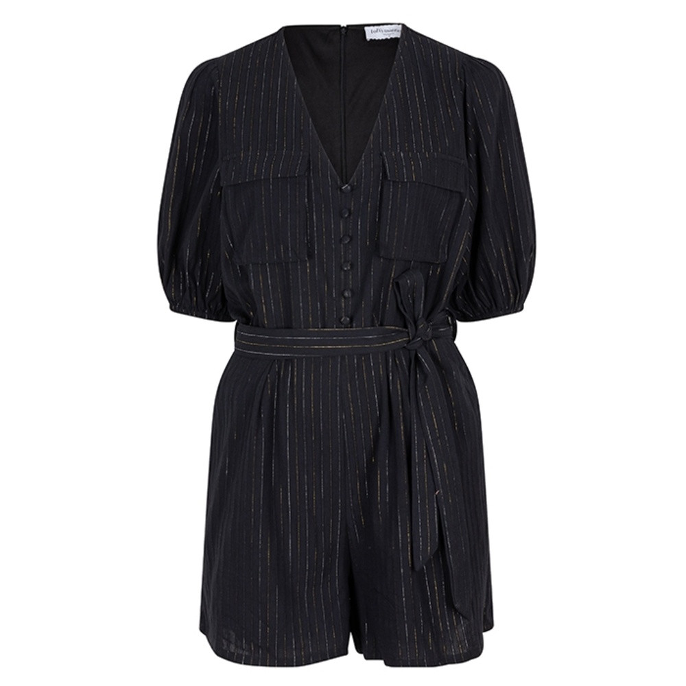 Wat deze playsuit echt bijzonder maakt, is de gouden lurex glinstering die subtiel door de stof geweven is. Hierdoor krijgt de playsuit een chique en feestelijke touch zonder te overdrijven. De fijne glitter zorgt voor een speels effect wanneer het licht erop valt – perfect voor zowel overdag als een avondje uit.