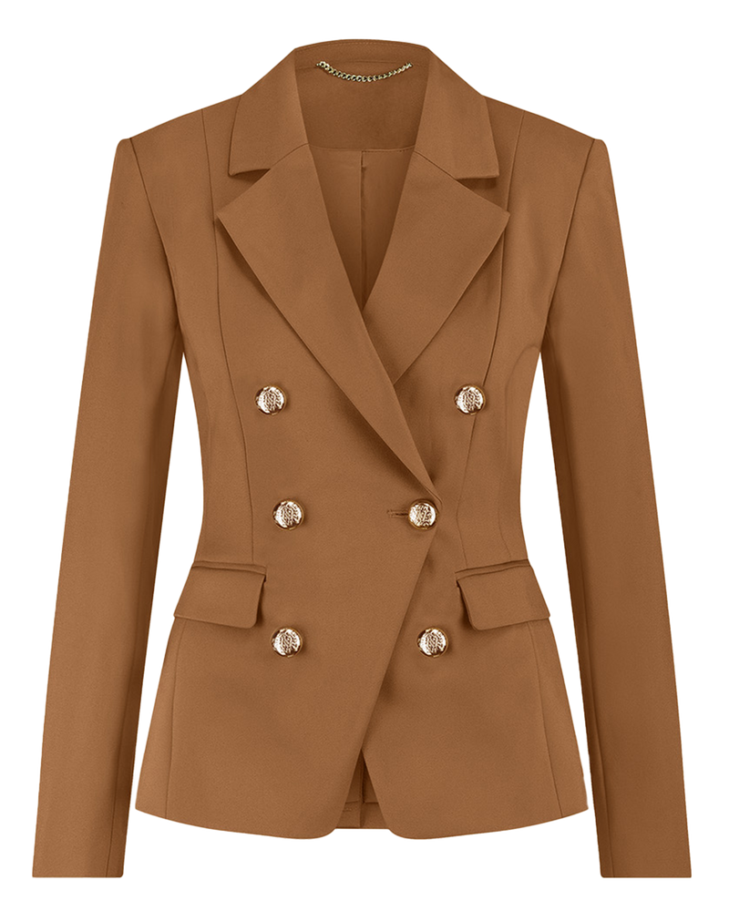 De Lancastero Blazer van NIKKIE is een elegante, getailleerde blazer die zowel stijl als functionaliteit biedt. Met zijn dubbele rij knopen met logo-details en twee klepzakken, is deze blazer een tijdloze toevoeging aan je garderobe. De effen kleur en het kraagloze ontwerp maken het veelzijdig en geschikt voor diverse gelegenheden. Het model is 174cm en draagt een 34.
