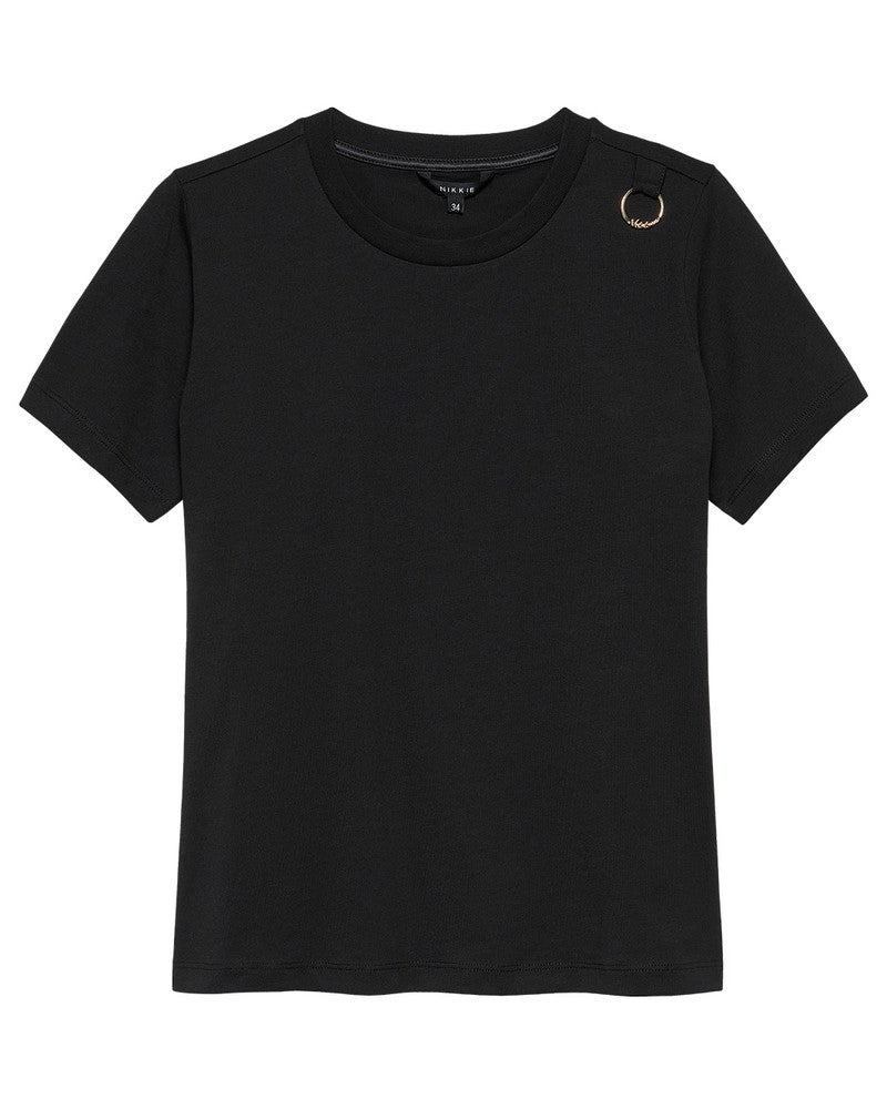 Het NIKKIE Logo Ring T‑Shirt is een eigentijdse must-have die comfort en stijl moeiteloos combineert. Het T‑shirt heeft een ronde hals en een normale pasvorm, waardoor het comfortabel zit. Het iconische N‑logo in een ringmotief op de voorkant zorgt voor een subtiel, maar direct herkenbaar statement, waardoor dit shirt een onderscheidend element toevoegt aan elke outfit. Gemaakt van hoogwaardig katoen voelt het T‑shirt zacht aan op de huid en is het ademend genoeg voor dagelijks gebruik. Door het eenvoudige, stijlvolle design is het makkelijk te combineren met verschillende items uit je garderobe, zoals een NIKKIE blazer, een pantalon of een rok, waardoor je zowel casual als chic kunt stylen. Dit NIKKIE T‑shirt is perfect voor wie een minimalistische, moderne uitstraling wil met een luxe touch en kan het hele jaar door gedragen worden.