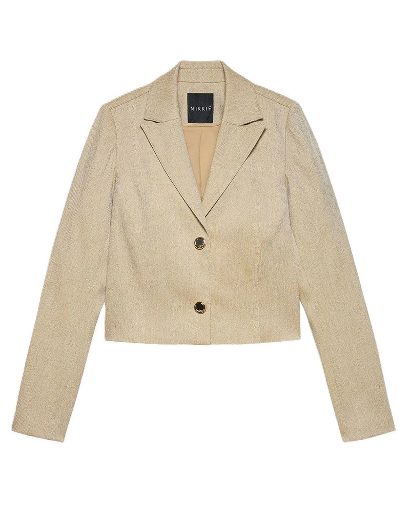 Het NIKKIE Olympia Jacket in beige is een elegant cropped jack dat direct een chique uitstraling geeft. Het subtiele glitterdraadje door de denimstof voegt een sprankelend effect toe, waardoor dit jasje perfect is voor zowel feestelijke als casual gelegenheden. De klassieke reverskraag en de goudkleurige knoopsluiting benadrukken de verfijnde stijl, terwijl de regular pasvorm zorgt voor een comfortabele en flatterende fit. Het patroon met glitter maakt het ontwerp extra opvallend, zonder te overheersen. Dit veelzijdige jasje is ideaal om te combineren met de bijpassende Olympia Pants Beige pantalon van NIKKIE voor een complete look of als opvallend detail over een eenvoudige top.