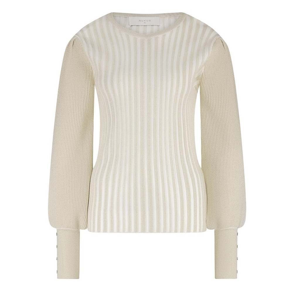 Het lijfje is voorzien van een fijn gestreept patroon in offwhite en zand, wat zorgt voor een speels, maar ingetogen kleurcontrast. De mouwen zijn effen zandkleurig en vormen een rustige tegenhanger. Zo ontstaat een mooi evenwicht tussen basic en bijzonder – ideaal voor het najaar.