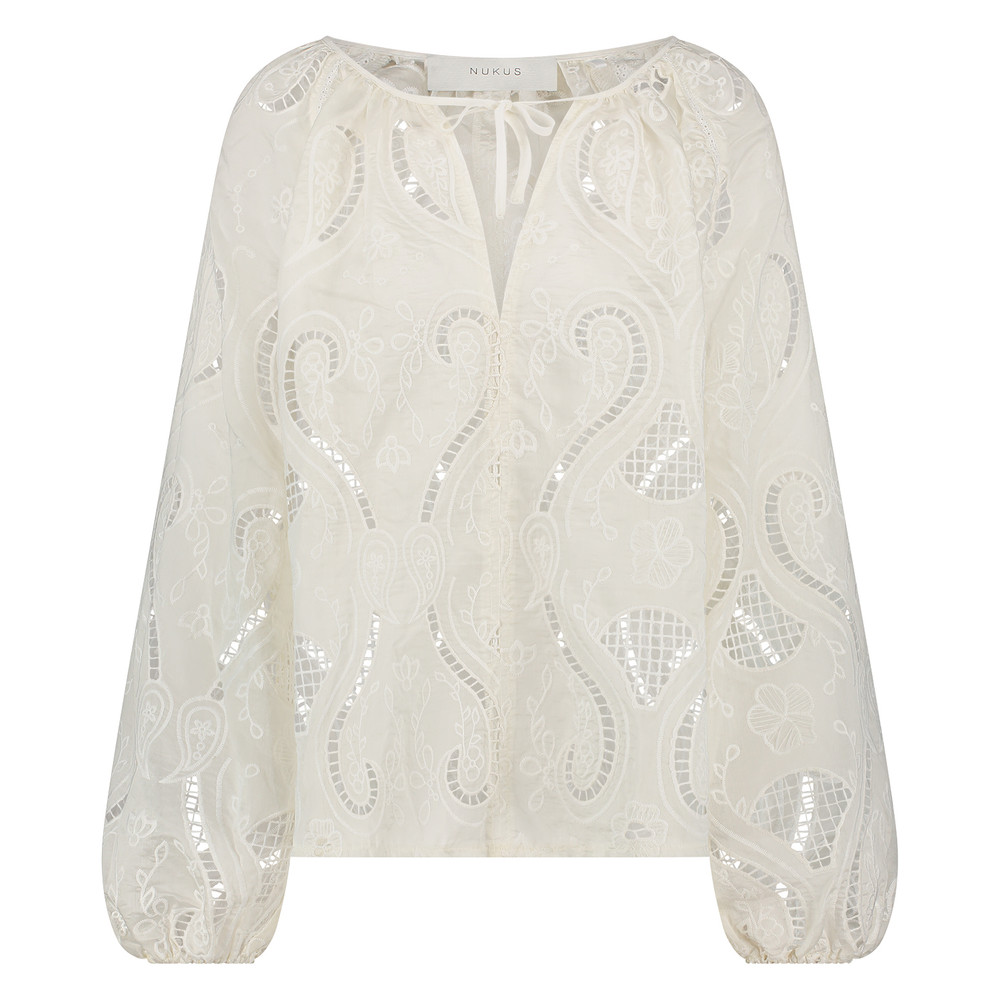De Nukus Yoni Top in off-white met een prachtige kantafwerking is de perfecte keuze voor een verfijnde en vrouwelijke uitstraling. Deze top is gemaakt van een zachte stof die heerlijk aanvoelt op de huid. Het delicate kant detail rondom de halslijn en de mouwen geeft de top een elegante en romantische flair, ideaal voor speciale gelegenheden of een chique casual look.