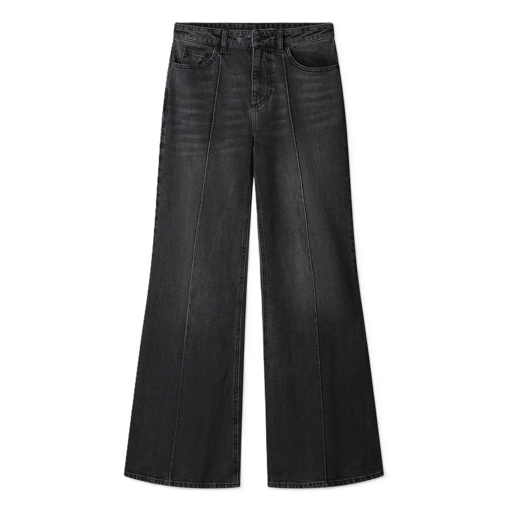 Met een binnenbeenlengte van 82 cm en een elegante flared pasvorm combineer je deze broek moeiteloos met hakken voor extra lengte of met sneakers voor een casual uitstraling. Het gewassen zwarte denim maakt dit item een veelzijdige essential die je eindeloos kunt stylen – van stoer tot chic.