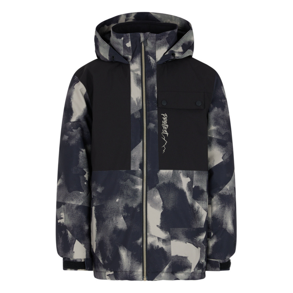 Deze ski- en snowboardjas is uitgerust met vaste capuchon, binnenmanchetten met duimlus, sneeuwvanger en placket aan de binnenkant, zodat wind, sneeuw en regen buiten blijven. Het 10 g ademend vermogen voert transpiratievocht effectief af, terwijl de 10.000 mm waterafstotende coating je kind droog houdt tijdens natte sneeuwdagen.