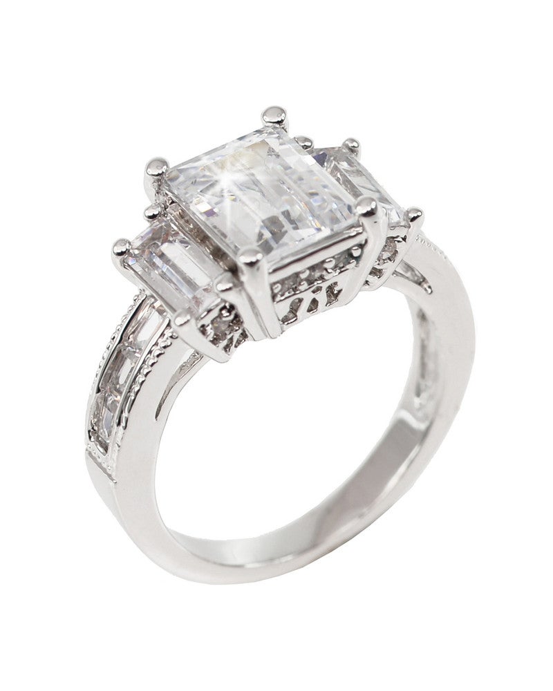 Deze prachtige ring, geïnspireerd op de verlovingsring van Angelina Jolie, heeft een rechthoekige grote centrale steen met aan weerszijden twee kleinere stenen. Voor het behoud van de glans raden we aan de ring af te doen wanneer je je handen wast of een crème gebruikt. Maten: US 5 = 15.75mm (49) / US 6 = 16.50mm (52) / US 7 = 17.25mm (54) / US 8 = 18.25mm (57) / US 9 = 18.75mm (59) / US 10 = 19.75mm (62)