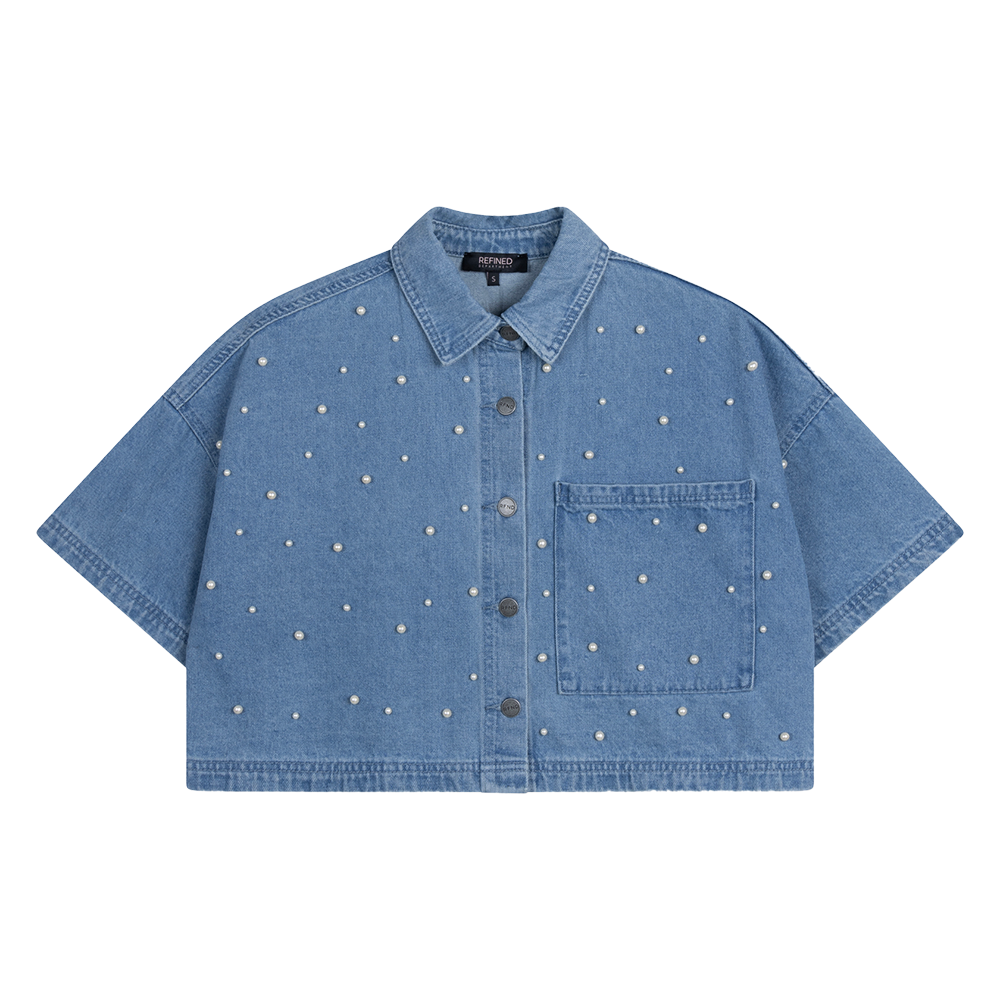 Deze korte mouwen denim blouse is een echte eyecatcher dankzij de subtiele parelversiering die de hele blouse elegant siert. De blouse heeft een klassieke kraag en een volledige knoopsluiting, wat zorgt voor een tijdloze en veelzijdige uitstraling. Dankzij de oversized pasvorm zit hij comfortabel en modern, terwijl je toch jouw normale maat kunt aanhouden voor de perfecte fit. Combineer deze blouse moeiteloos met een jeans, zoals de PAYTON jeans, voor een trendy en complete look die zowel casual als chic gedragen kan worden. Het model is 170cm en draagt een 36.