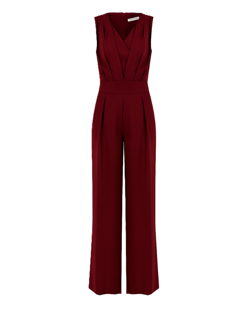De diepe V-hals en de plooien op het lijfje zorgen voor een verfijnd silhouet en voegen een stijlvolle touch toe aan het bovenlichaam. Deze details maken de jumpsuit bijzonder flatterend en geven een gevoel van luxe en vrouwelijkheid.
