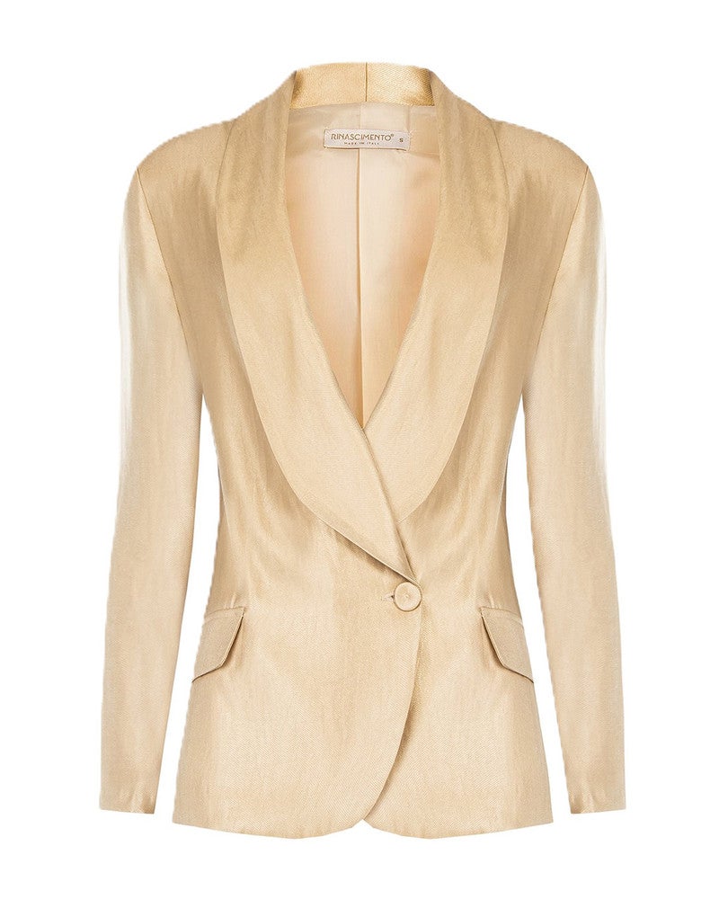 Deze Rinascimento blazer is een echte eyecatcher. De dames blazer geeft je outfit direct een chique uitstraling. Door de goude kleur, is dit item makkelijk te combineren met een leuke pantalon of jeans. Ideaal voor een feestelijke gelegenheid. Deze goude blazer is leuk te combineren met de bijpassende Rinascimento