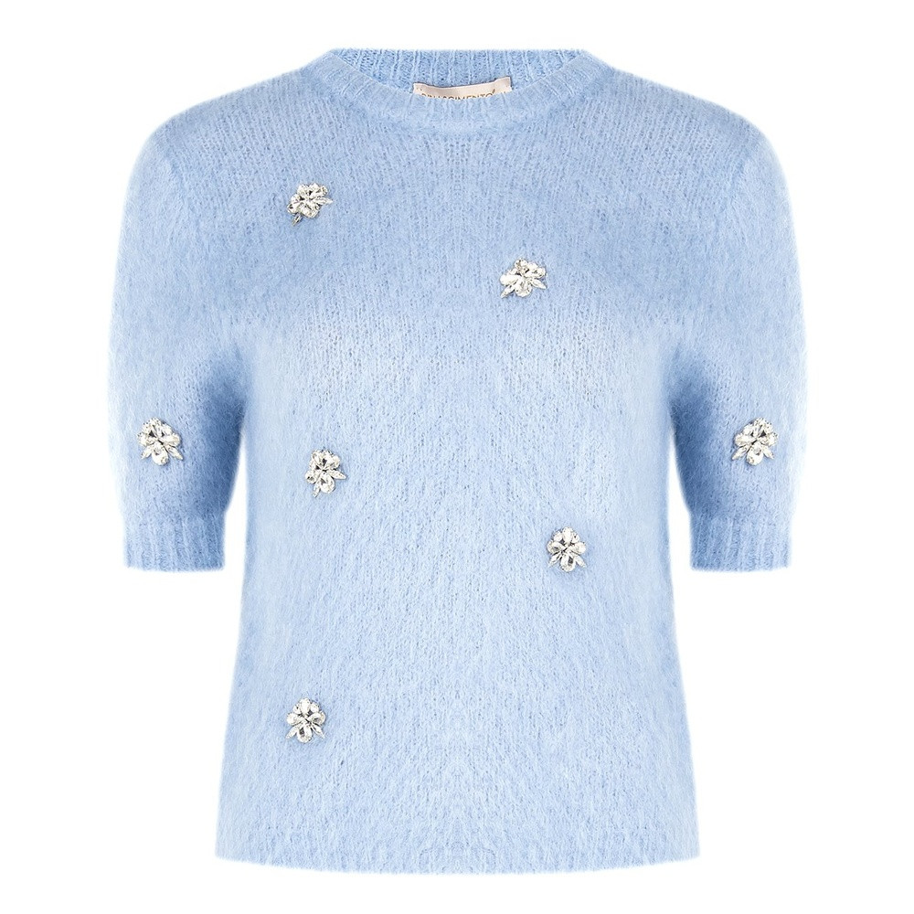 De Light Blue Fluffy Sweater with Stones van Rinascimento is een verfijnde en vrouwelijke trui die perfect is voor het nieuwe seizoen. Gemaakt van een zachte mohair-wolblend voelt de trui heerlijk comfortabel aan en geeft hij een luxueus, volumineus effect. De delicate pastelblauwe kleur en de subtiele stenenversiering voegen een elegante, sprankelende touch toe, geïnspireerd op vintage preppy-stijlen.
