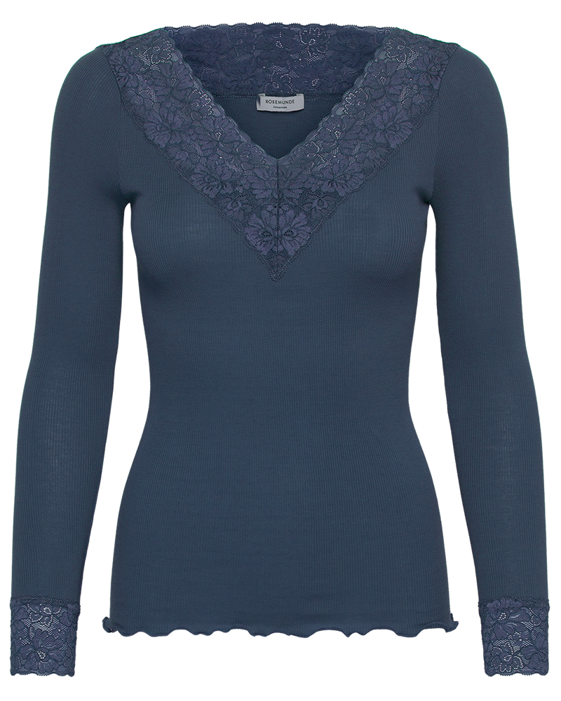 RosemundeRWBernadine Organic LS V-neck Lace T-shirt Donker Blauw