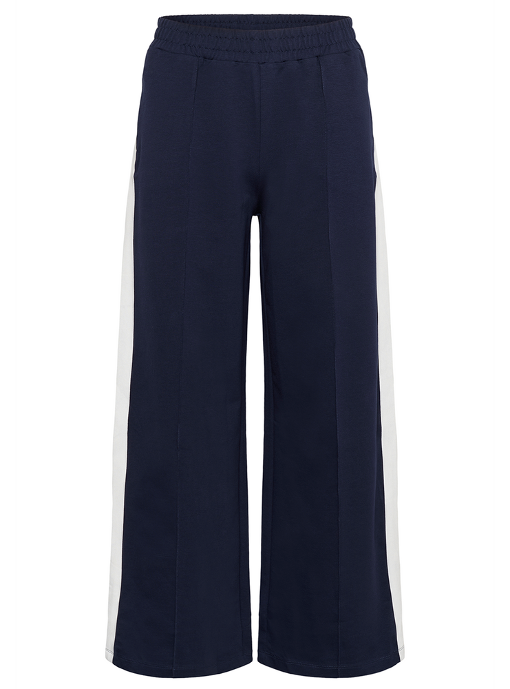 De OsakaSZ broek van Saint Tropez is een moderne en comfortabele keuze voor wie stijl en gemak wil combineren. Deze jerseybroek in marineblauw heeft een relaxte pasvorm met wijde pijpen, wat zorgt voor een nonchalante en eigentijdse uitstraling. De offwhite zijpanelen voegen een sportieve flair toe, waardoor de broek zowel casual als gekleed gedragen kan worden.