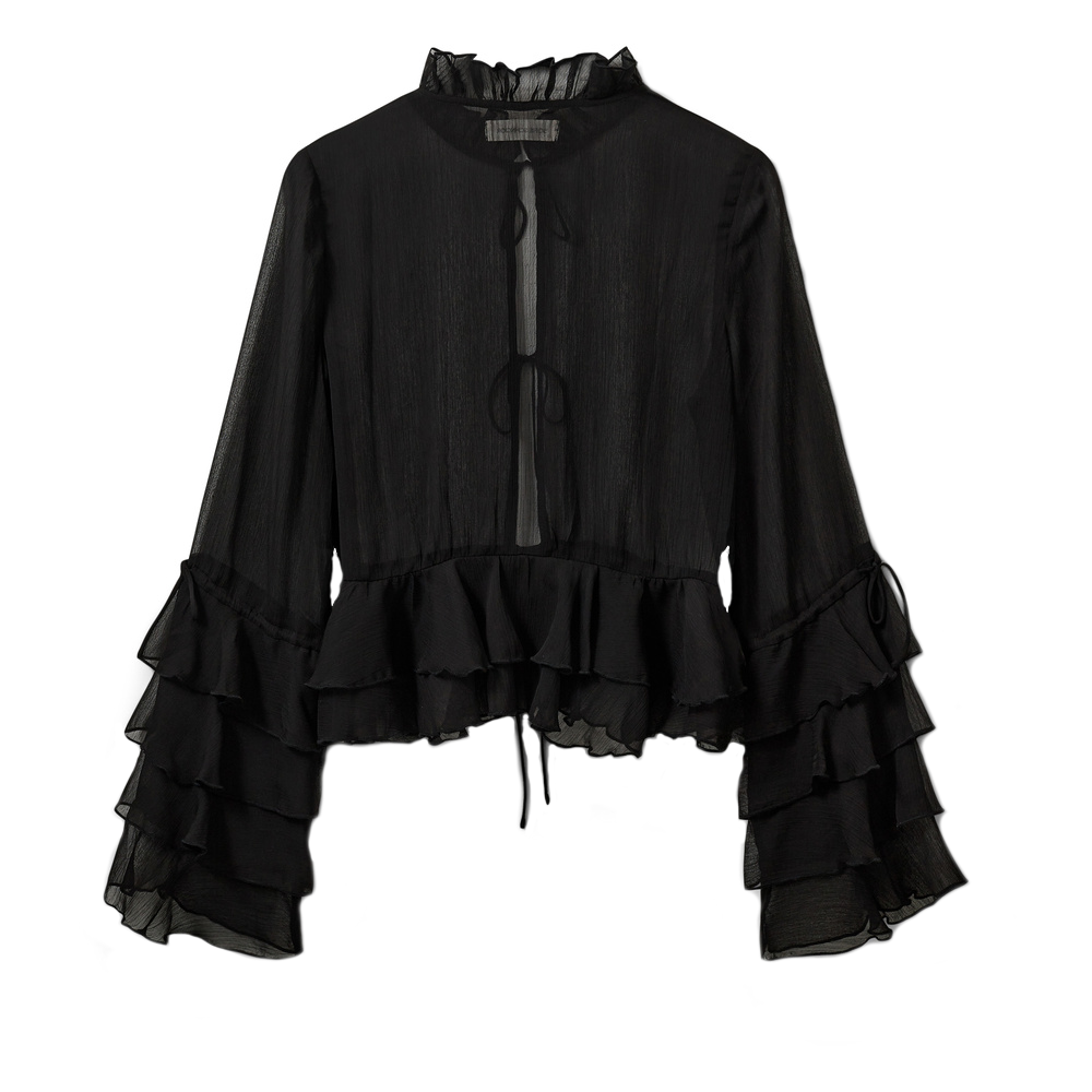 De Maci van Sofie Schnoor is een verfijnde zwarte blouse die moeiteloos elegantie toevoegt aan je garderobe. Gemaakt van 100% polyester met een lichte transparantie, heeft deze blouse een regular fit die flatterend valt. De ruffle-kraag met striksluiting aan de voorkant geeft een romantisch accent, terwijl de lange mouwen met ruches en strikdetails bij de polsen een speelse en vrouwelijke uitstraling bieden. Met strikjes zowel bij de hals als in de taille kun je de pasvorm naar wens aanpassen. Deze veelzijdige top is geschikt voor zowel formele als informele gelegenheden en voegt een vleugje charme toe aan elke outfit. Het model is 177cm en draagt een 36.