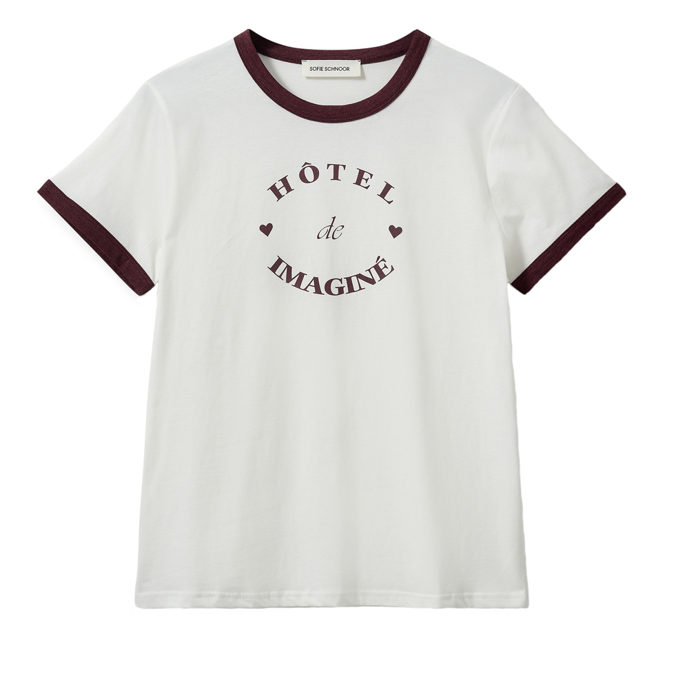 Het Maggie T-shirt van Sofie Schnoor brengt je in gedachten naar zonnige roadtrips en retro motels. Met de opvallende Hotel Imagine print op de voorkant en contrasterende details langs de hals en mouwen heeft dit shirt een nostalgische uitstraling die helemaal van nu is.