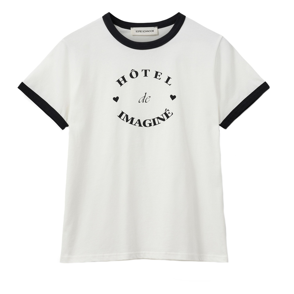 Het Maggie T-shirt van Sofie Schnoor brengt je in gedachten naar zonnige roadtrips en retro motels. Met de opvallende Hotel Imagine print op de voorkant en contrasterende details langs de hals en mouwen heeft dit shirt een nostalgische uitstraling die helemaal van nu is.
