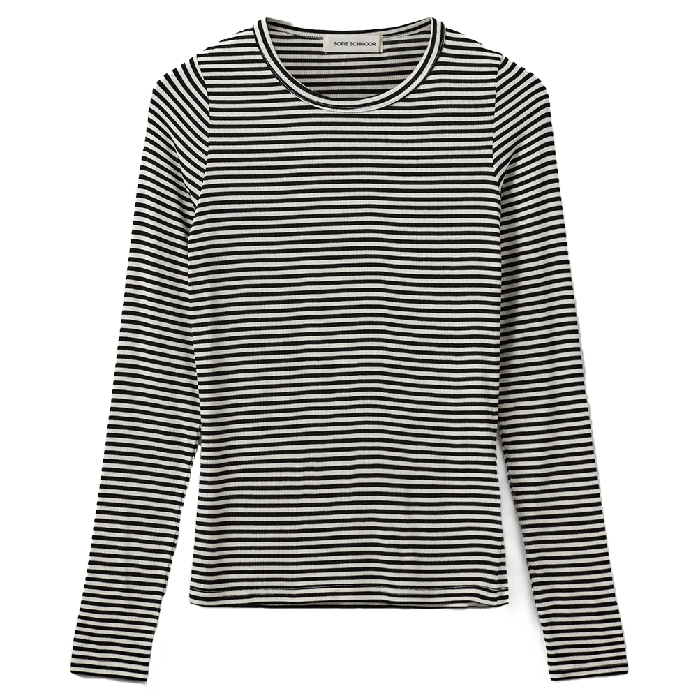 Dit Petricia zwarte T-shirt met subtiele strepen van Sofie Schnoor is een echte klassieker die je eindeloos kunt combineren. Dankzij de slim fit pasvorm sluit het mooi aan op het lichaam, waardoor het zowel vrouwelijk als comfortabel oogt.