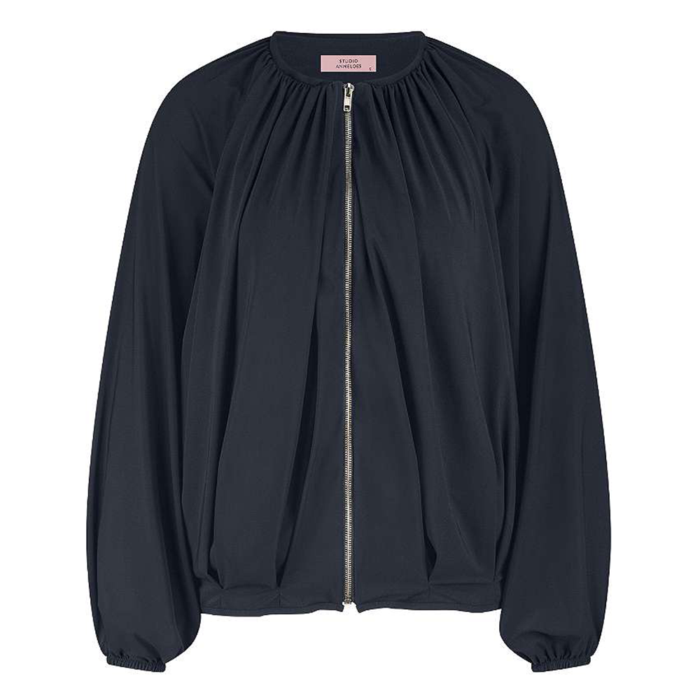 De Dinte jacket in Dark Blue van Studio Anneloes is een stijlvol jasje dat je look direct een moderne upgrade geeft. Het unieke silhouet met vleermuismouwen en een ronde hals maakt dit item een echte blikvanger. Dankzij de soepele Light Travelstof valt het jasje luchtig en elegant om het lichaam, terwijl de elastische manchetten zorgen voor een comfortabele en sportieve touch.