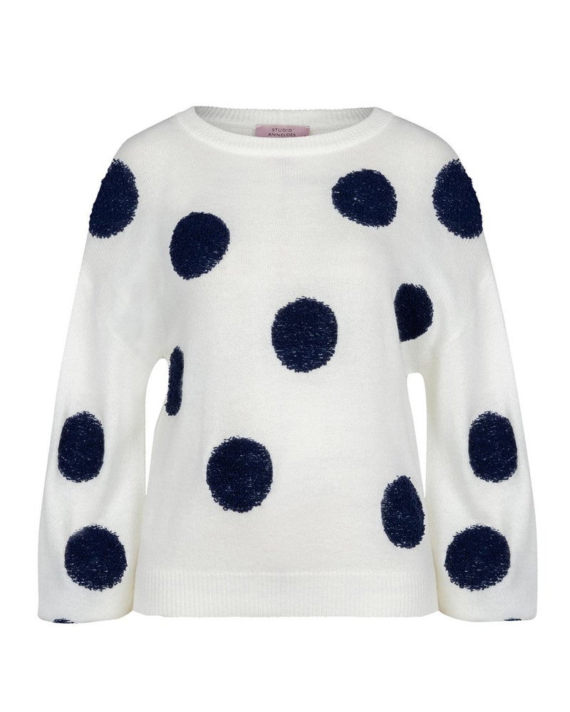 Levie trousers. Het speelse stippenmotief voegt een retro twist toe en laat zich gemakkelijk mixen met andere prints of neutrale items. De Eliza Dot Pullover is daarmee een heerlijk zachte, comfortabele trui die moeiteloos stijl en karakter samenbrengt.