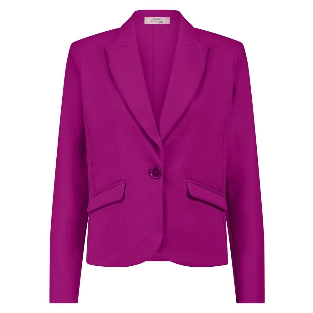 De FELICI Bonded Structure Blazer van Studio Anneloes is een chique statementstuk uit de Elegant Encounters-collectie. Deze getailleerde blazer in een opvallende magenta kleur biedt de perfecte balans tussen comfort en een verfijnde uitstraling. Het reliëfpatroon in de Bonded Travelstof geeft de blazer een luxe uitstraling, terwijl de rekbare stof zorgt voor bewegingsvrijheid gedurende de dag. De schoudervullingen en klepzakken versterken de klassieke elegantie van het ontwerp, terwijl de enkele knoopsluiting het makkelijk maakt om de blazer zowel formeel als casual te combineren.