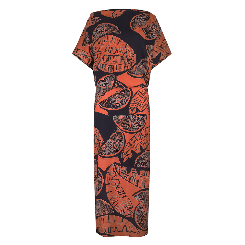 Zin in een jurk die net zo zonnig is als de zomer zelf? De Ineke Orange Dress van Studio Anneloes laat je stralen met haar speelse sinaasappelprint in de warme tinten Ginger Spice, Dark Blue en Ecru. Deze maxi jurk is het perfecte item voor lange zomerdagen, zwoele avonden en alles daartussenin.