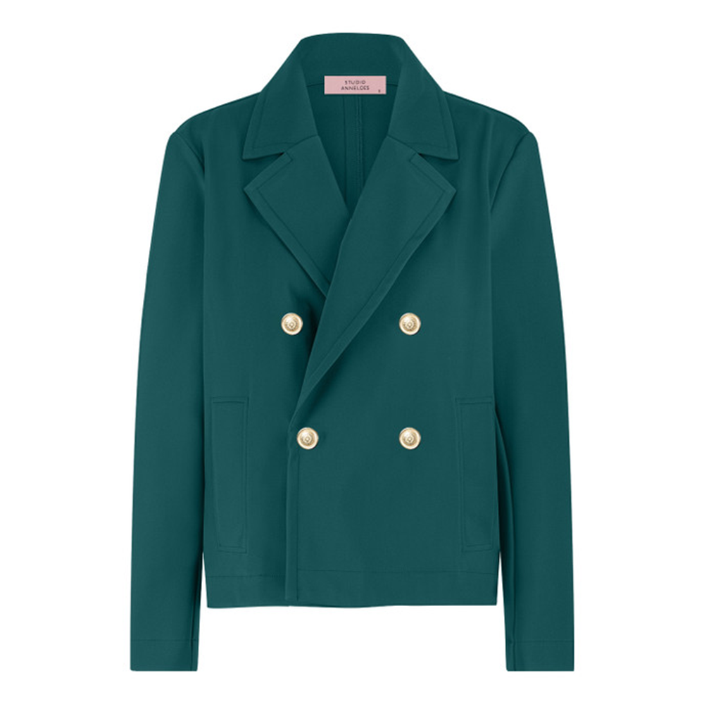 Geef je outfit direct een verfijnde uitstraling met de Jade Bonded Blazer van Studio Anneloes in de diepe kleur Bottle Green. Deze blazer heeft een regular fit die comfortabel zit en tegelijkertijd een nette, gestructureerde look biedt. De lange mouwen en de klassieke reverskraag maken hem perfect voor zowel werk als een chique casual look.