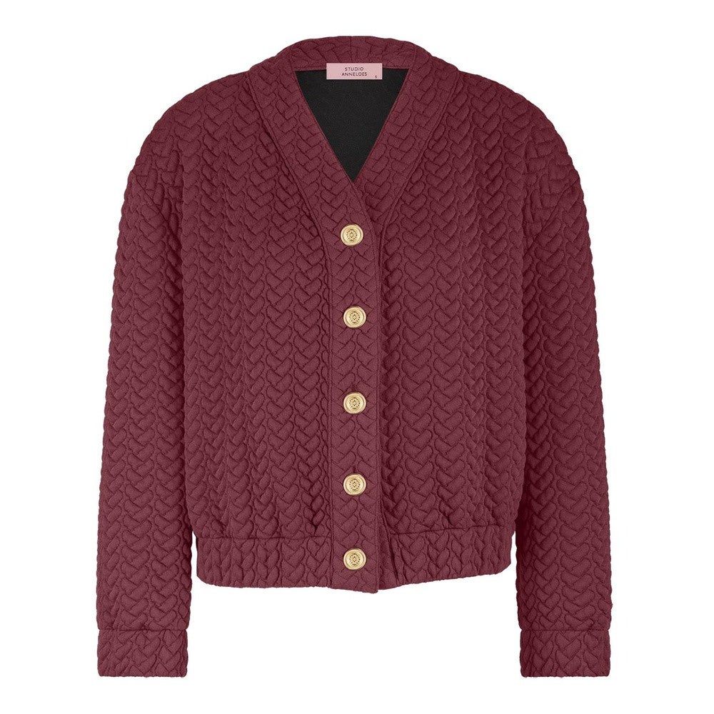 Geef je najaarsgarderobe een stijlvolle update met de Josephine Structure Jacket van Studio Anneloes. Dit bijzondere jasje valt direct op door de rijke vlechtstructuur in de stof, die zorgt voor een luxe en speelse uitstraling. De diepe bordeauxrode kleur straalt warmte en elegantie uit, terwijl de glanzende gouden knopen een chique detail toevoegen. Dankzij de regular fit en het kreukvrije materiaal draag je dit jasje moeiteloos, zowel naar kantoor als tijdens een avondje uit. De V-hals en lange mouwen maken het een veelzijdig item dat je zowel open als dichtgeknoopt kunt dragen. Combineer hem met een mooie blouse en pantalon voor een zakelijke look, of draag hem over een jurk voor een meer vrouwelijke en feestelijke uitstraling. Het model is 177cm en draagt een 36.