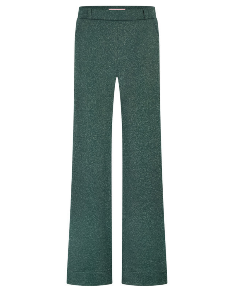 De Lexie Sparkle Trousers van Studio Anneloes is een perfecte combinatie van luxe, comfort en moderne elegantie. De diepe groentint krijgt extra karakter door subtiele zilveren draden die bij elke beweging zachtjes schitteren. Zo creëer je moeiteloos een stijlvolle look die zowel overdag als ’s avonds perfect tot zijn recht komt.