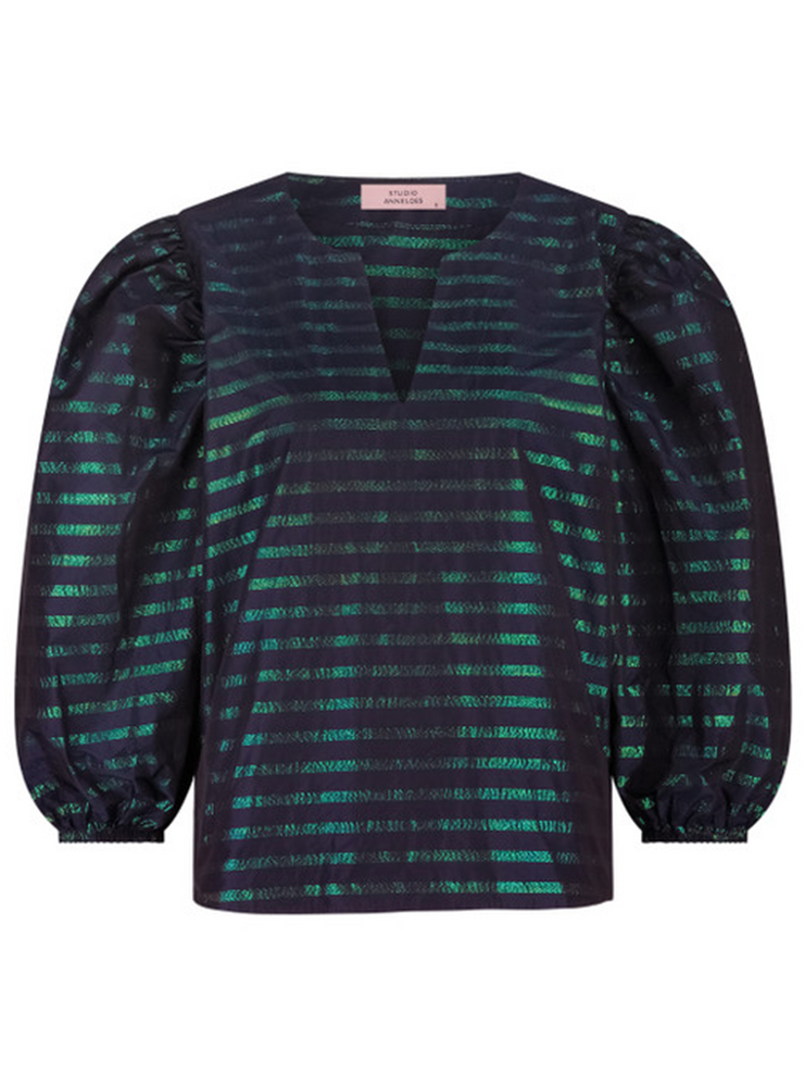 Laat je look schitteren met de Xara Sparkle Stripe blouse van Studio Anneloes. De combinatie van donkerblauw en bottle green metallic strepen zorgt voor een subtiele glans die bij elke beweging oplicht en een elegante, feestelijke touch toevoegt.
